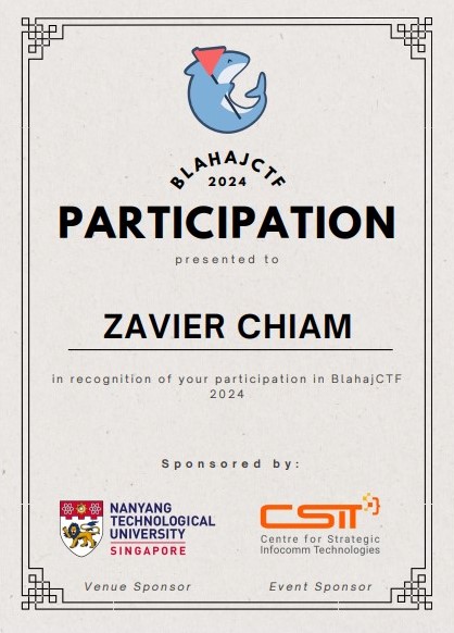 Participated in Blahaj-themed CTF sponsored by CSIT and NTU.