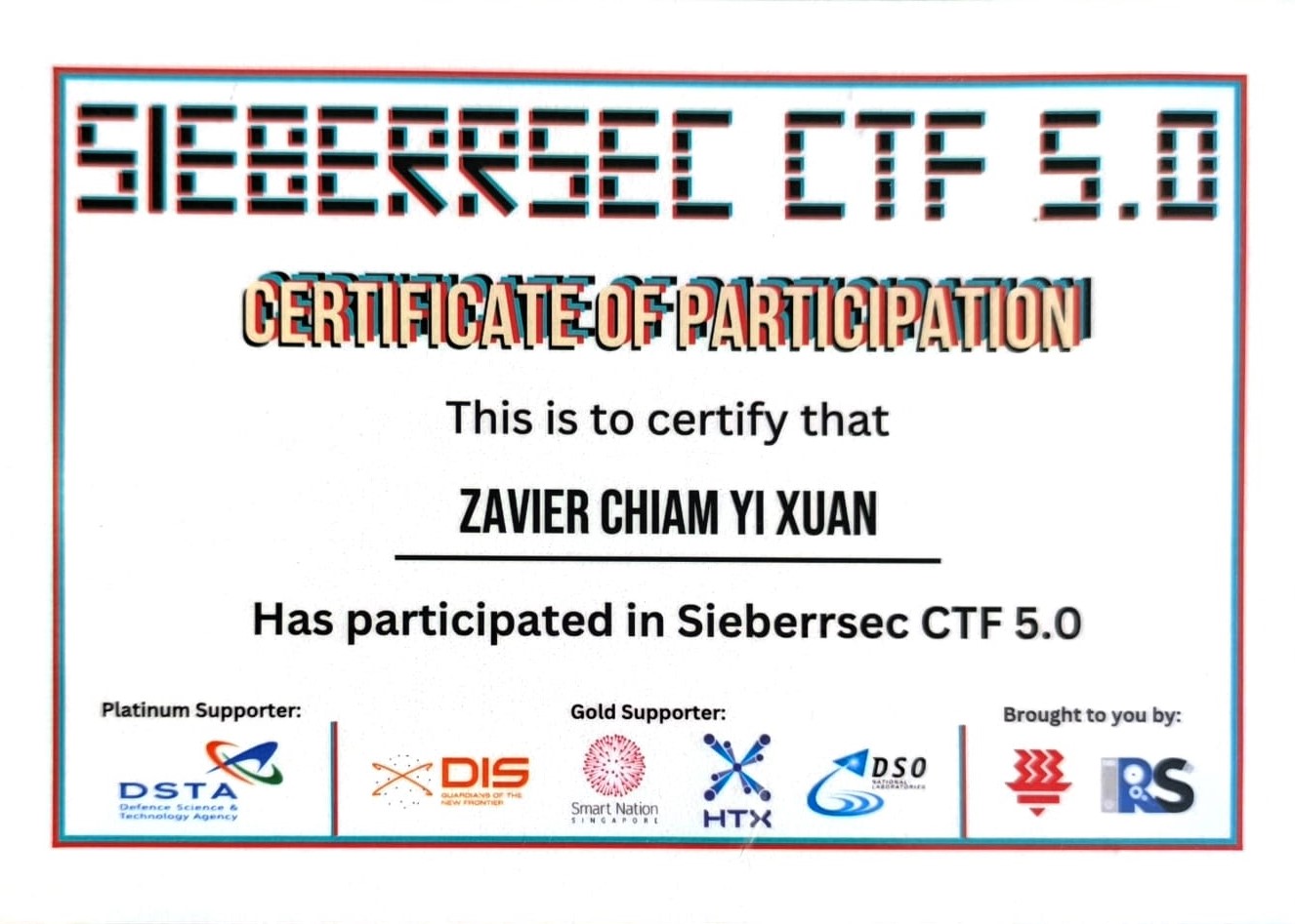 Participated in Sieberrsec CTF 5.0 organized by Hwa Chong Institution.